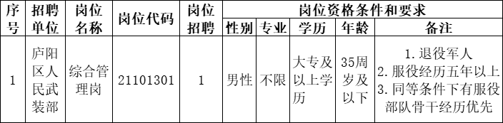 因根據(jù)工作需要,經(jīng)廬陽區(qū)人民武裝部研究決定,現(xiàn)委托遠創(chuàng)人力資源管理集團有限公司面向社會公開招考工作人員1名,現(xiàn)將有關(guān)事項公告如下: