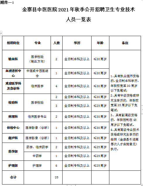 2021-10-28 14:06:38閱讀()金寨縣中醫(yī)醫(yī)院為進(jìn)一步加強(qiáng)醫(yī)院衛(wèi)生專業(yè)技術(shù)人才隊(duì)伍建設(shè),結(jié)合我院醫(yī)療業(yè)務(wù)快速發(fā)展需要,根據(jù)縣委縣政府《關(guān)于深化公立醫(yī)院綜合改革實(shí)施方案》文件精神,經(jīng)研究決定,2021年秋季面向社會(huì)公開招聘各類衛(wèi)生專業(yè)技術(shù)人員25名(詳見附件一),現(xiàn)就有關(guān)事項(xiàng)公告如下: