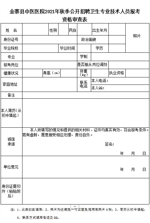 3、網(wǎng)上報(bào)名者可在金寨縣中醫(yī)醫(yī)院網(wǎng)站上下載《金寨縣中醫(yī)醫(yī)院2021年秋季公開招聘衛(wèi)生專業(yè)技術(shù)人員報(bào)考資格審查表》(如實(shí)填寫健康狀況及身高體重),將填寫完整的報(bào)考資格審查表、近期一寸正面免冠同底照片及報(bào)名所需材料的掃描件或清晰照片以附件的形式上傳。在發(fā)送郵件“主題”中注明真實(shí)姓名+專業(yè)+報(bào)考崗位,每位報(bào)考者限報(bào)1個(gè)崗位,須使用統(tǒng)一有效居民身份證參加報(bào)名和考試(如未按要求提交報(bào)名材料或上傳材料不全視為報(bào)名無效,無考試資格,不再另行通知)。請報(bào)考人員在報(bào)名審核表上準(zhǔn)確填寫聯(lián)系電話和地址,如有變化請及時(shí)告知。