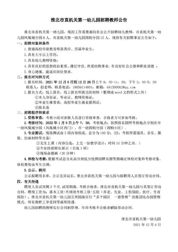 2021年淮北市直機(jī)關(guān)第一幼兒園招聘教師公告