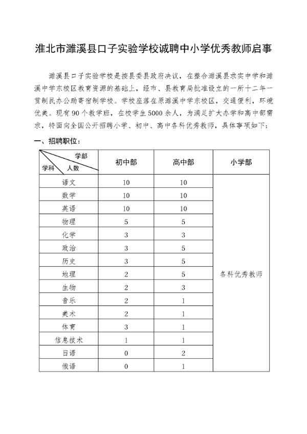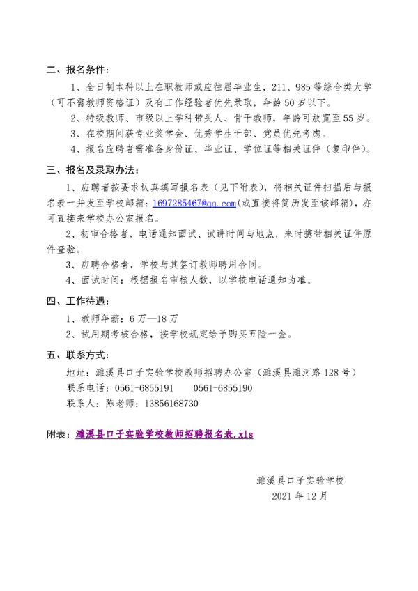 2021年淮北市濉溪縣口子實驗學校誠聘中小學優(yōu)秀教師啟事