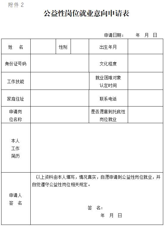 (一)報(bào)名。符合條件人員請于2022年3月8日前填寫《公益性崗位就業(yè)意向申請表》(見附件2),向市就業(yè)管理中心提交報(bào)名申請。