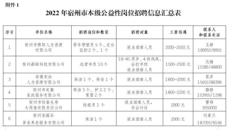 附件1:2022年宿州市本級公益性崗位招聘信息匯總表