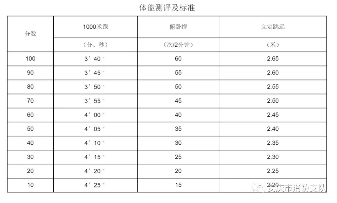 3、體能測評成績:測試成績采取從高到低排名,換算為對應(yīng)的百分制成績測算,滿分為100分,體能測評三個項目必須達標(60分)。