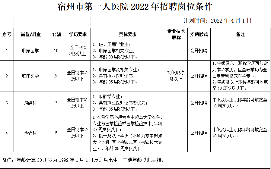 三、招聘崗位:具體詳見《宿州市第一人醫(yī)院2022年招聘崗位條件》