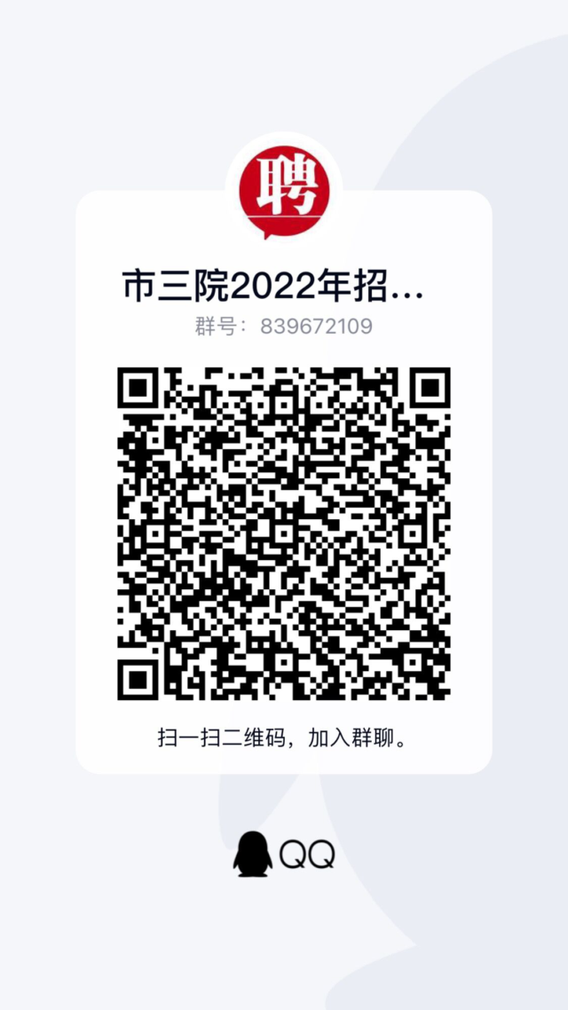 因疫情影響,報(bào)名采取網(wǎng)上報(bào)名方式。報(bào)名人員可通過(guò)銅陵市第三人民醫(yī)院網(wǎng)站(網(wǎng)址:http://www.tl-sy.com/)或掃碼進(jìn)群查看招聘信息,下載招聘人員報(bào)名表,填寫完畢后發(fā)送至電子郵箱635423407@qq.com,同時(shí)附身份證、畢業(yè)證書、學(xué)位證書、執(zhí)業(yè)資格證書、學(xué)校就業(yè)推薦表等掃描件。