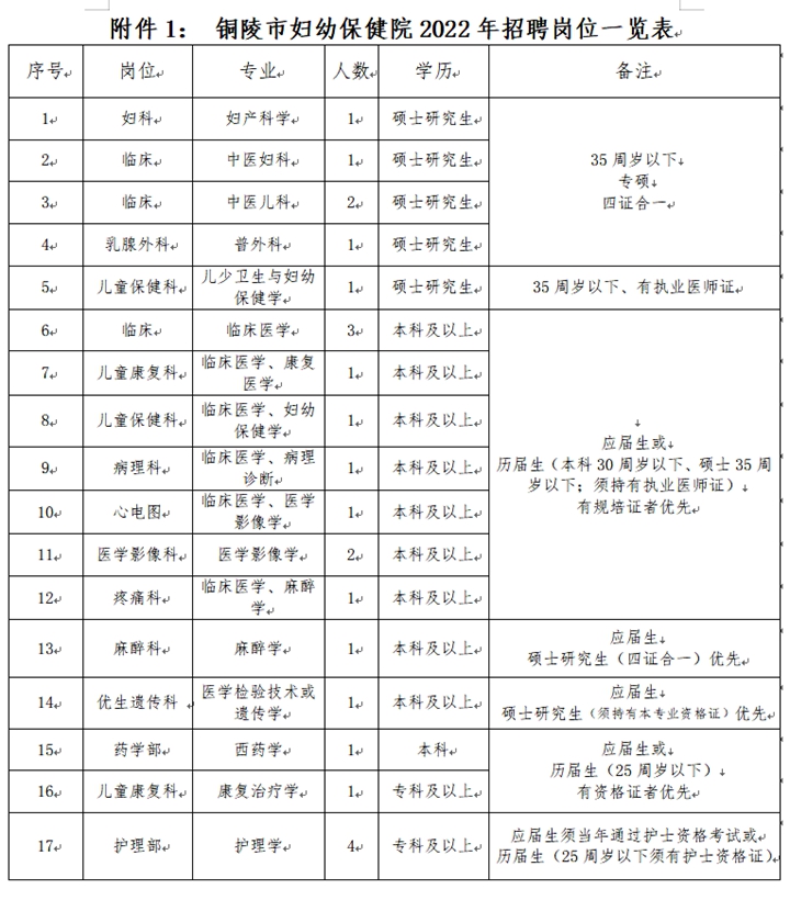見(jiàn)附件1《銅陵市婦幼保健院2022年招聘崗位一覽表》