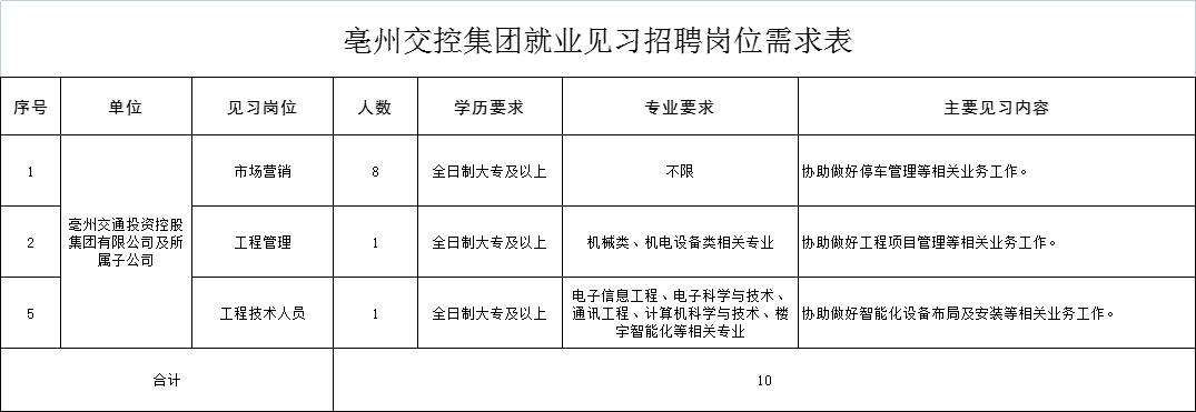 招聘崗位條件及崗位職責詳見附件《亳州交控集團就業(yè)見習招聘崗位需求表》。