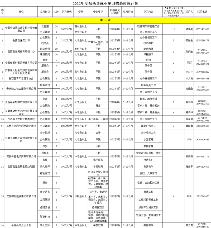 截止目前已征集見習(xí)崗位399個(含第一批),具體崗位情況、招聘條件、見習(xí)待遇及見習(xí)內(nèi)容等見附件《2022年度岳西縣就業(yè)見習(xí)招募崗位計劃(第二批)》(含第一批未招滿)。