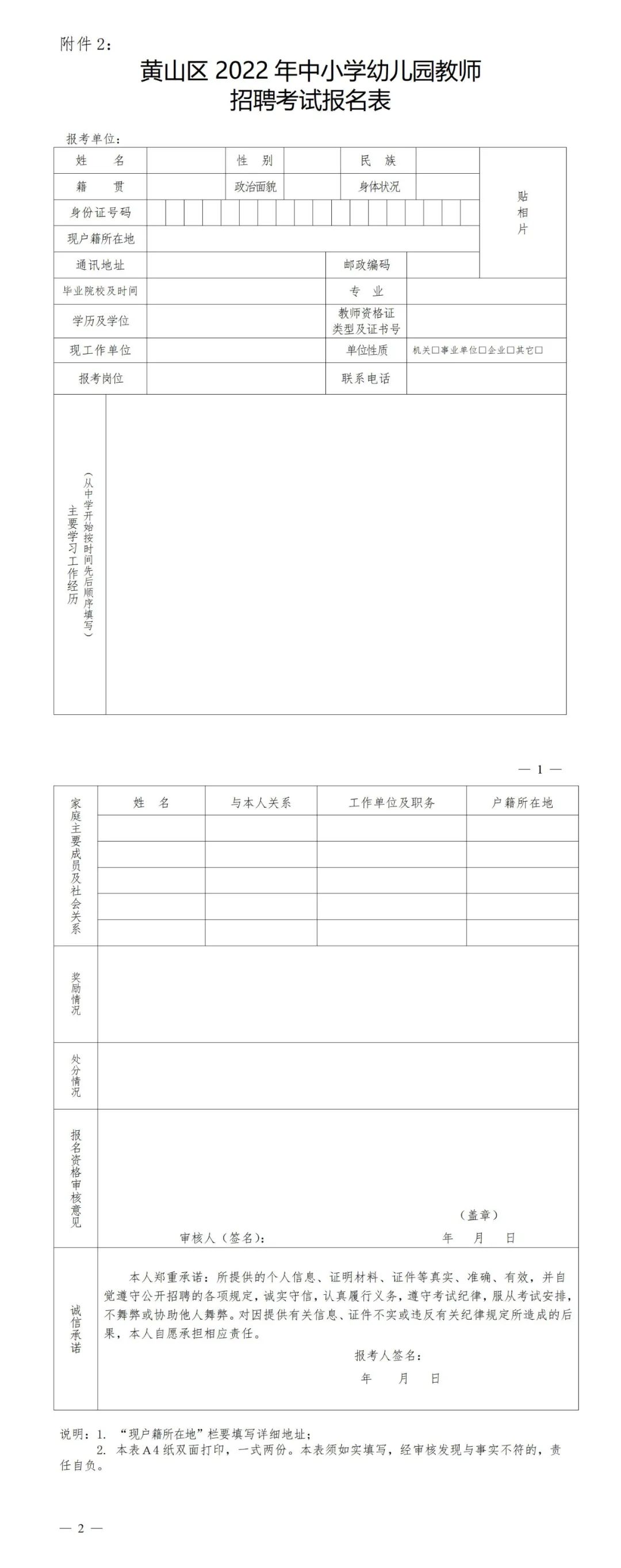2.黃山區(qū)2022年中小學(xué)幼兒園教師招聘考試報(bào)名表
