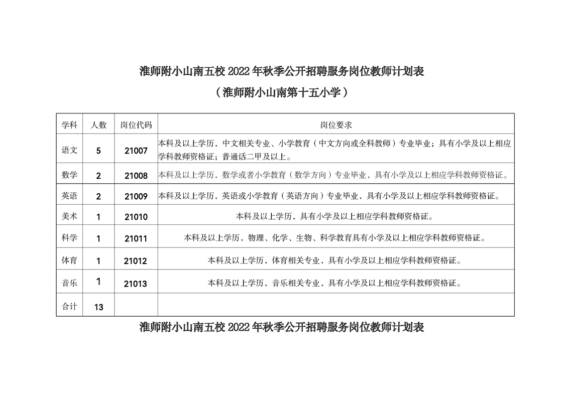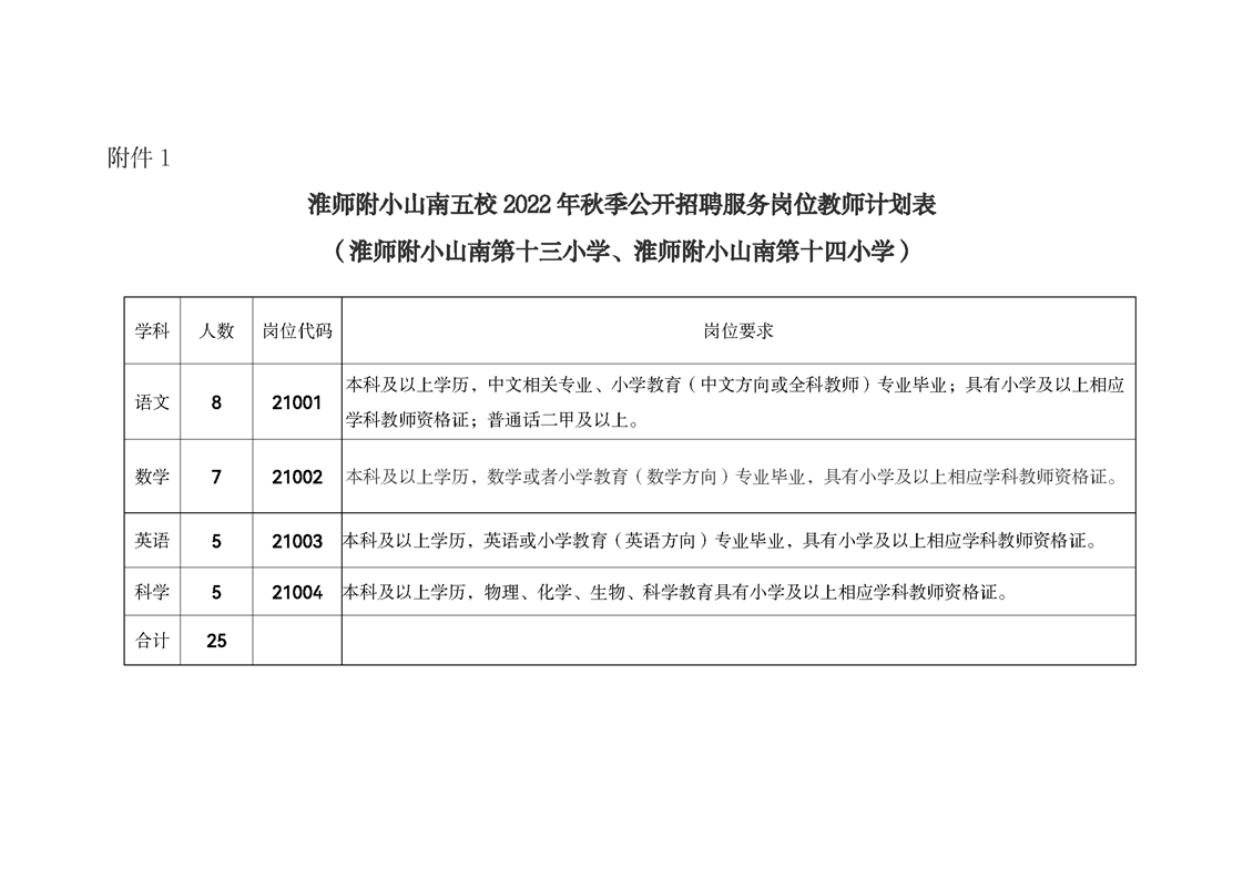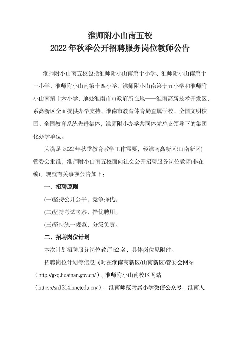 為滿足2022年秋季教育教學工作需要,經(jīng)淮南高新區(qū)(山南新區(qū))管委會批準,淮師附小山南五校面向社會公開招聘服務崗位教師(非在編)?,F(xiàn)就有關事項公告如下: