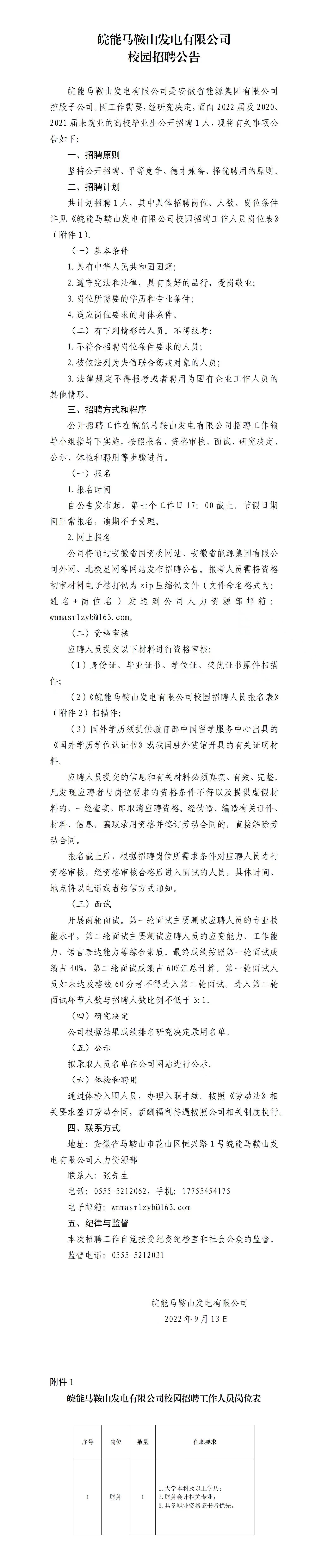 共計劃招聘1人,其中具體招聘崗位、人數、崗位條件詳見《皖能馬鞍山發(fā)電有限公司校園招聘工作人員崗位表》(附件1)。