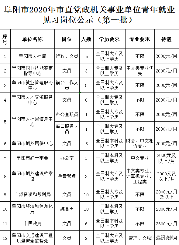 為提高高校畢業(yè)生的就業(yè)能力,根據安徽省人社廳《關于印發(fā)安徽省就業(yè)見習管理辦法的通知》(皖人社發(fā)[2017]54號)和安徽省人社廳等三部門聯合下發(fā)的《關于做好2020年機關事業(yè)單位就業(yè)見習工作的通知》(皖人社秘﹝2020﹞98號)精神,阜陽市面向市直黨政機關、事業(yè)單位(含公益一類和參公事業(yè)單位)征集就業(yè)見習崗位,吸納畢業(yè)兩年內未就業(yè)的高校畢業(yè)生參加就業(yè)見習。現公告如下: