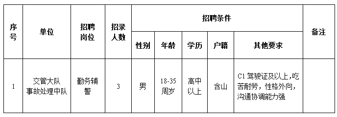 交通事故處理中隊(duì)勤務(wù)輔警3名。