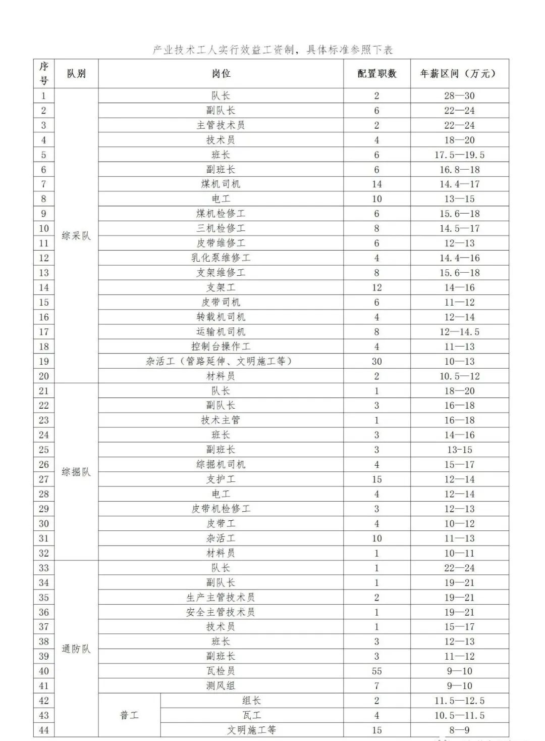(2)區(qū)隊管理人員實行年薪制、產(chǎn)業(yè)技術(shù)工人實行效益工資制,具體標(biāo)準(zhǔn)參照下表: