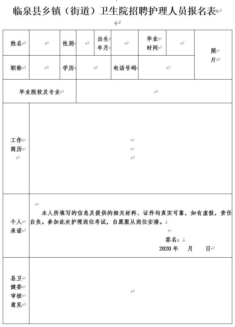 1、臨泉縣鄉(xiāng)鎮(zhèn)(街道)衛(wèi)生院招聘護理人員報名表