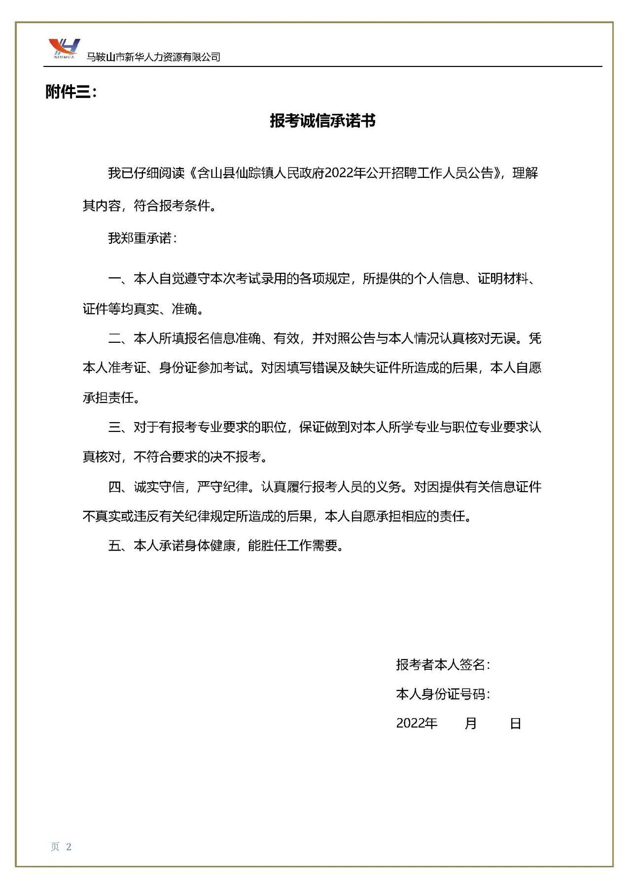(5)本人簽名確認(rèn)的《報(bào)考誠(chéng)信承諾書(shū)》(附件三,請(qǐng)自行下載填寫(xiě)并打印);