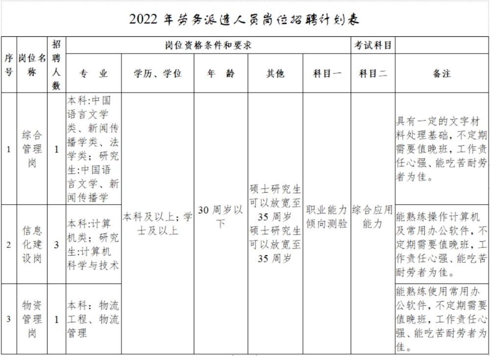 本次公開招聘綜合管理崗1名、信息化建設崗3名、物資管理崗1名。