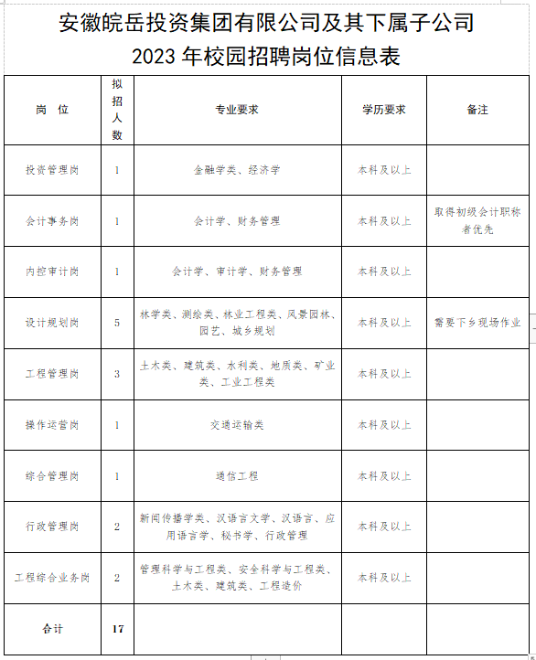 根據(jù)工作需要,安徽皖岳投資集團有限公司及其下屬子公司擬面向安徽大學、合肥工業(yè)大學、安徽財經(jīng)大學、安徽工程大學、安徽工業(yè)大學、安徽建筑大學、安徽理工大學、安徽農(nóng)業(yè)大學、安慶師范大學、安徽師范大學、淮北師范大學2023屆畢業(yè)生招錄17名工作人員,現(xiàn)就有關事項公告如下:
