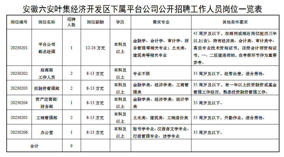 根據(jù)工作需要,安徽六安葉集經(jīng)濟(jì)開發(fā)區(qū)下屬平臺(tái)公司(國有企業(yè))現(xiàn)擬面向社會(huì)公開招聘9名工作人員,現(xiàn)就有關(guān)事項(xiàng)公告如下: