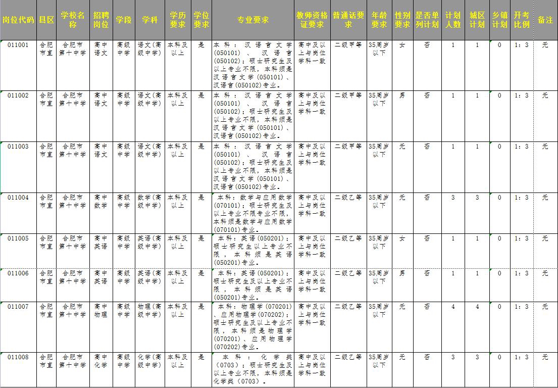 根據(jù)合肥市教育局、合肥市人力資源和社會保障局聯(lián)合發(fā)布的《2023年度合肥市直屬學(xué)校新任教師公開招聘公告》,合肥十中此次共招聘語文(3人)、英語(2人)、數(shù)學(xué)(3人)、物理(4人)、化學(xué)(3人)教師15名,具體崗位要求如下: