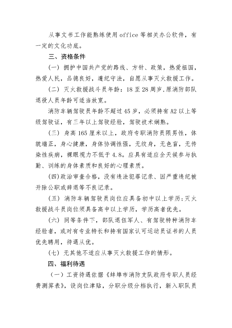 (六) 同等條件下,部隊(duì)退伍軍人、有駕駛特種消防車經(jīng)驗(yàn)者,或?qū)τ袑I(yè)特長(zhǎng)和持有國家認(rèn)可運(yùn)動(dòng)員證書的人員優(yōu)先聘用,待遇從優(yōu)。