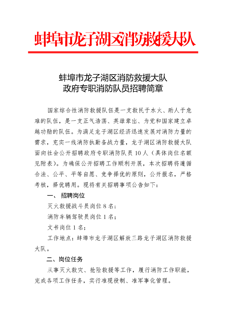 七、本招聘簡(jiǎn)章解釋權(quán)歸蚌埠市龍子湖區(qū)消防救援大隊(duì)所有,長(zhǎng)期有效。