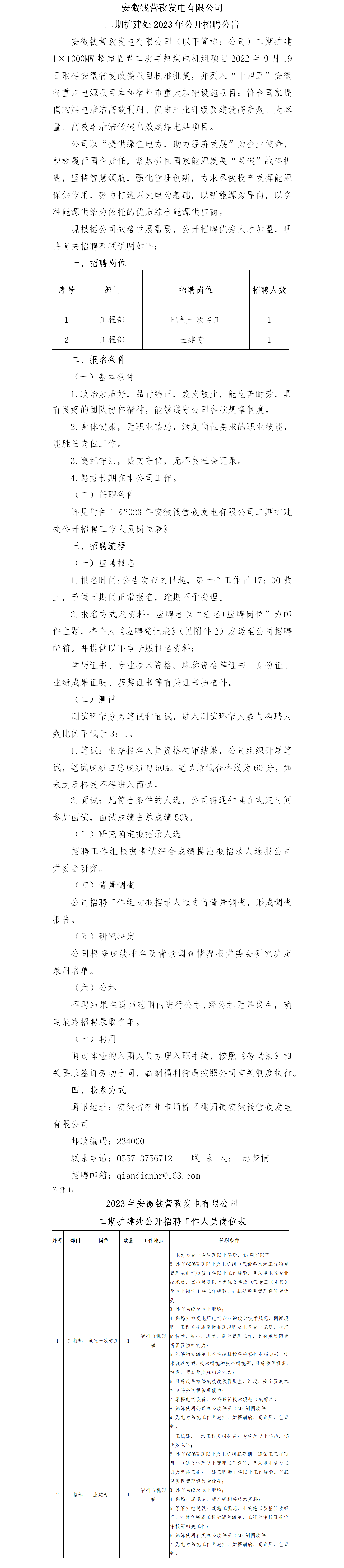 2023年安徽錢營孜發(fā)電有限公司二期擴建處公開招聘公告