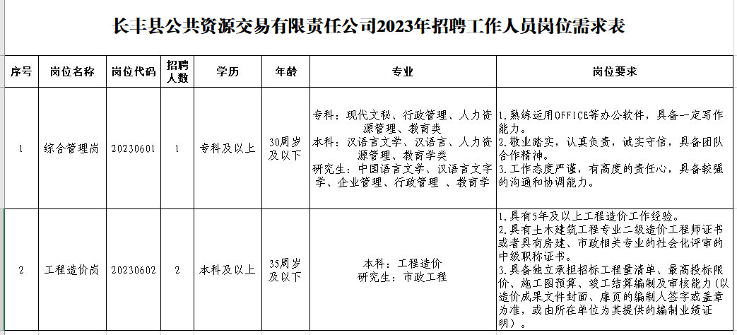 附件1:長(zhǎng)豐縣公共資源交易有限責(zé)任公司2023年招聘工作人員崗位需求表