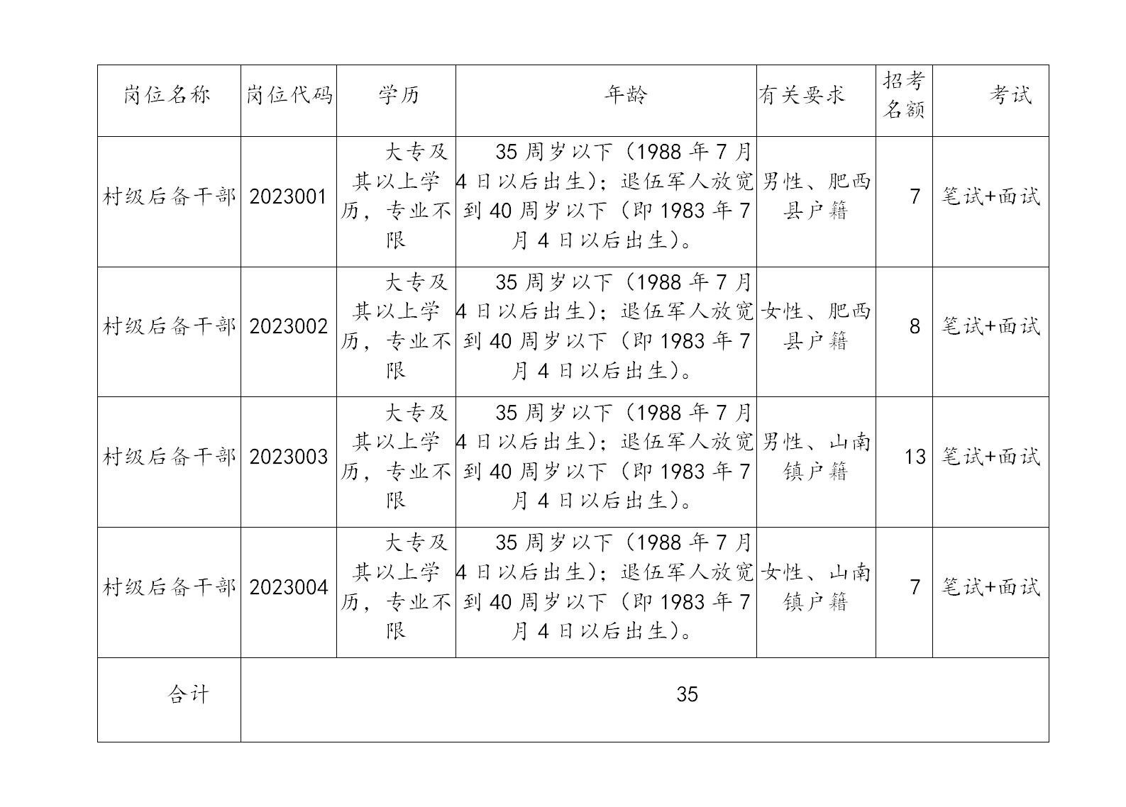 計劃招考35名村級后備干部,其中肥西縣戶籍15名;山南鎮(zhèn)戶籍20名。詳見附表。