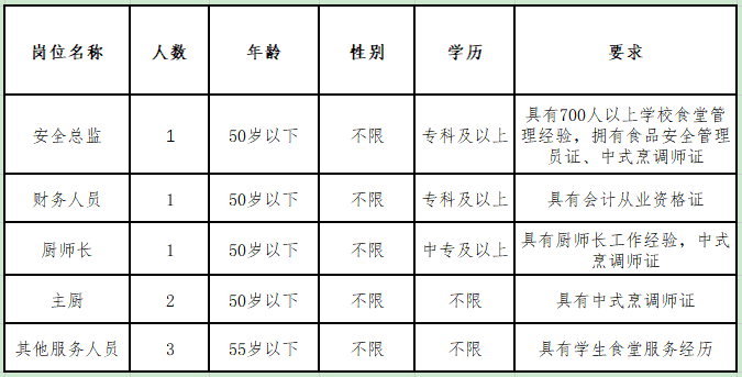 因?qū)W校食堂工作需要,現(xiàn)面向社會(huì)招聘工作人員,具體如下: