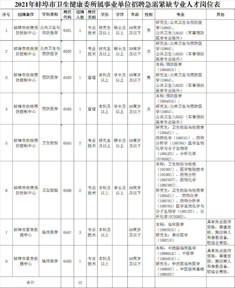 2021年蚌埠市衛(wèi)生健康委所屬事業(yè)單位招聘急需緊缺專業(yè)人才崗位表