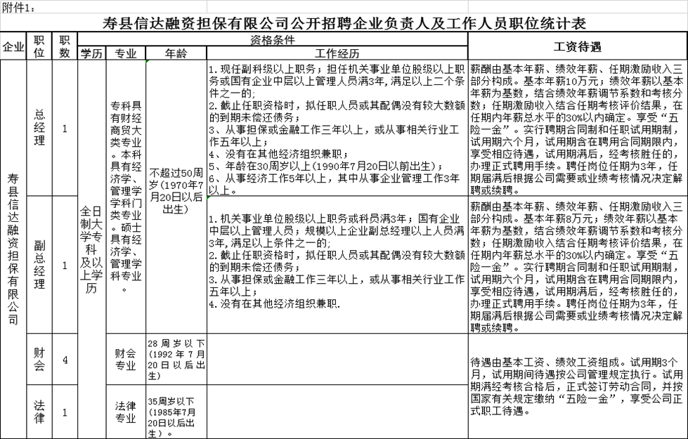 2020年淮南壽縣信達(dá)融資擔(dān)保有限公司公開招聘企業(yè)負(fù)責(zé)人及工作人員職位統(tǒng)計表