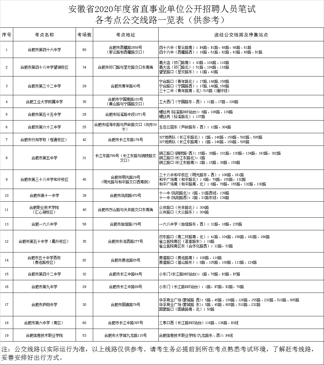 2020年安徽省直事業(yè)單位招聘人員筆試各考點公交線路一覽表(供參考)