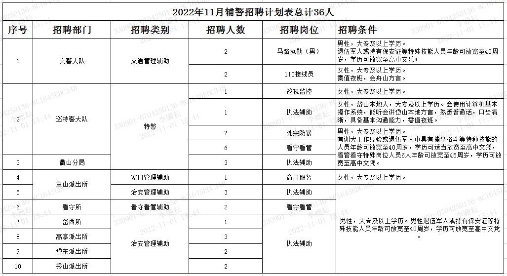 2022-11-13 19:45:07閱讀()岱山縣人民政府因工作需要,岱山縣公安局面向社會公開招聘警務(wù)輔助人員,有意者可以按以下規(guī)定條件和程序報名。